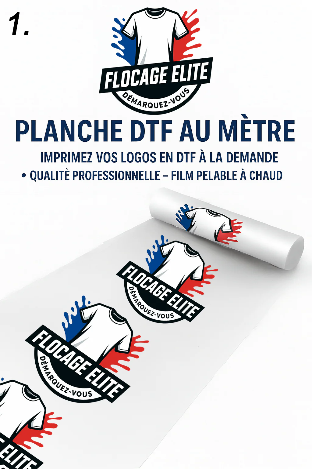 Commandez vos planches DTF personnalisées au mètre linéaire et imprimez vos logos, visuels ou motifs en qualité professionnelle.